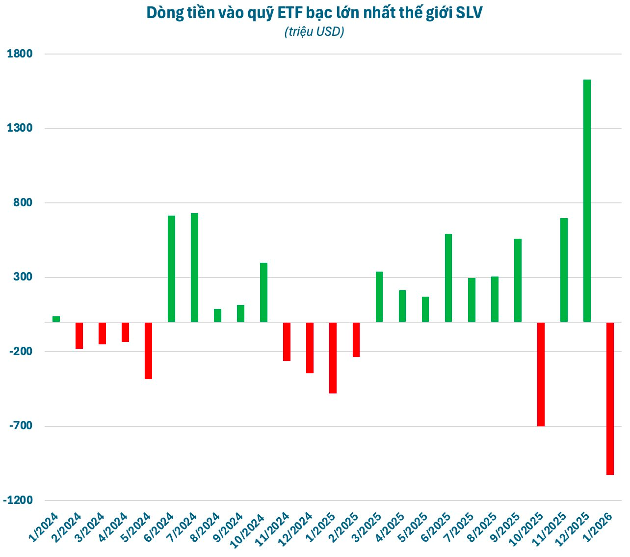 Đáng chú ý, động thái quay trở lại gom mua của các nhà đầu tư lớn cũng góp phần hỗ trợ giá bạc. Sau giai đoạn tranh thủ chốt lời, quỹ bạc lớn nhất thế giới iShares Silver Trust ETF (SLV) do BlackRock quản lý đã mua ròng trở lại trong phiên cuối tuần trước. Tuy nhiên, tính từ đầu năm đến nay, quỹ này vẫn ghi nhận giá trị bán ròng hơn 1 tỷ USD.