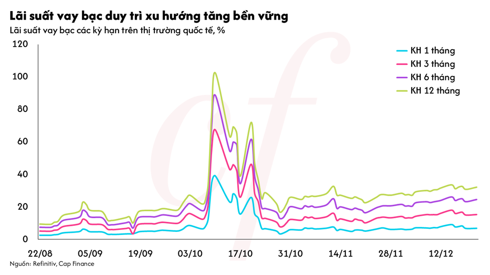 (1), lãi suất thuê bạc đã tăng liên tục tại mọi kỳ hạn, từ mức 2.56% hồi đầu tháng 08, lên 6.82% trong phiên hôm qua (23/12) với mức đỉnh gần nhất là 9.14% hôm 15/12. Chúng ta hãy bỏ qua cú nấc hồi tháng 10, đẩy lãi suất kỳ hạn 1 tháng lên tận 40%.