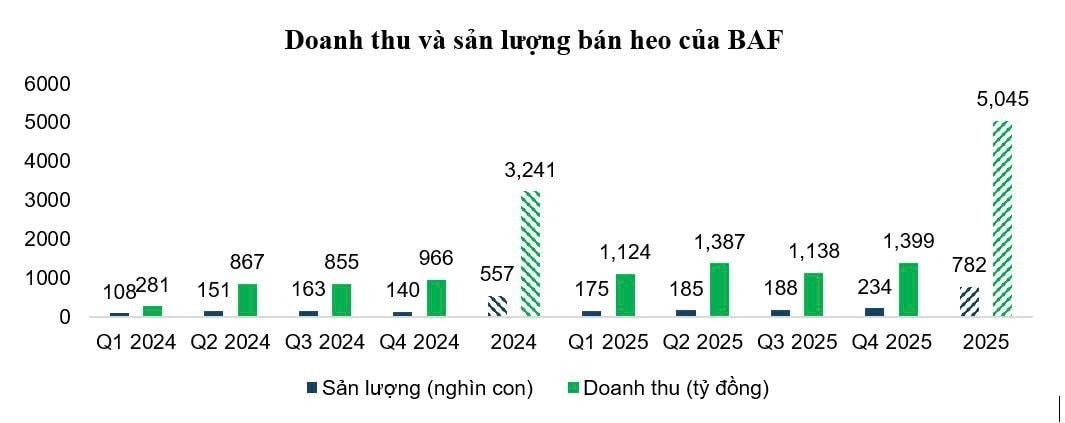 Q4/2025, BAF ghi nhận doanh thu lần đầu tiên vượt mốc trên 1.400 tỷ đồng – mức cao nhất kể từ khi doanh nghiệp triển khai chiến lược phát triển chuỗi chăn nuôi khép kín và “về đích” năm 2025 với doanh thu vượt 5.000 tỷ đồng, tăng trưởng 28,6% so với năm 2024.