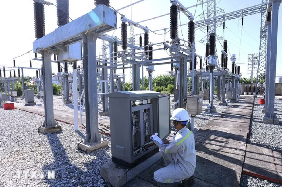 Kiểm tra, giám sát hệ thống điện ở trạm biến áp 110kw ở xã Vĩnh Hậu, tỉnh Cà Mau. (Ảnh: Vũ Sinh/TTXVN)