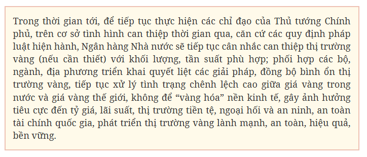 Ngân hàng Nhà nước cũng chỉ đạo các tổ chức tín dụng, doanh nghiệp được cấp phép kinh doanh mua, bán vàng miếng chấp hành nghiêm túc các quy định của pháp luật về hoạt động kinh doanh vàng; thực hiện chế độ hóa đơn, chứng từ theo quy định pháp luật.