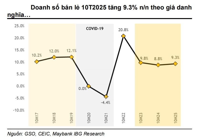 "Với mục tiêu Chính phủ đặt ra là tăng trưởng GDP 10%/năm giai đoạn 2026–2030, tiêu dùng tư nhân sẽ phải đóng vai trò then chốt. Chúng tôi kỳ vọng các biện pháp kích cầu bổ sung – kế thừa các chính sách giảm VAT, miễn học phí, và cải cách TNCN – sẽ giúp đưa tốc độ tăng trưởng doanh số bán lẻ trở lại mức 11–12%/năm, tương đương trước COVID-19", MSVN nhận định.