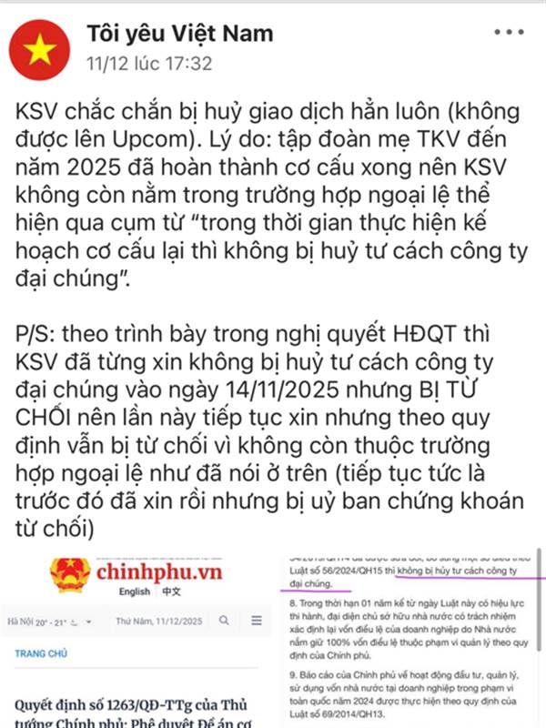 Nguyên nhân chính dẫn đến đà giảm này xuất phát từ lo ngại của nhà đầu tư về rủi ro Vimico bị hủy tư cách công ty đại chúng bắt buộc từ ngày 1/1/2026. Do cơ cấu cổ đông cô đặc (TKV nắm giữ hơn 98%), KSV không đáp ứng đủ điều kiện về tỷ lệ cổ phiếu tự do chuyển nhượng theo quy định của Luật Chứng khoán.