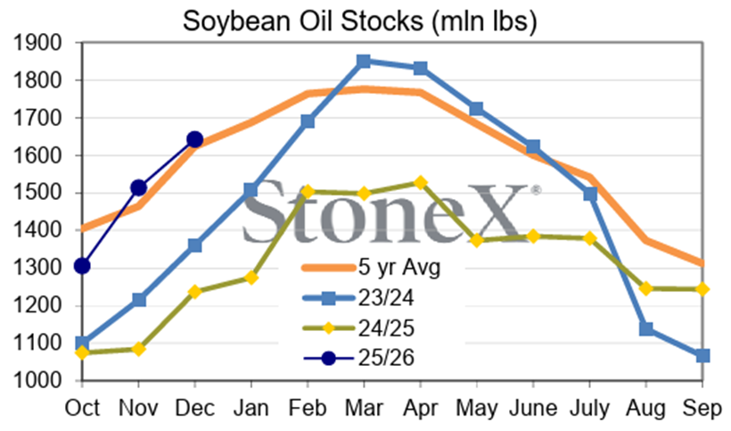 Việc các nhà máy đẩy mạnh ép dầu đương nhiên sẽ tạo ra một lượng lớn dầu đậu tương. Tuy nhiên, để đánh giá đúng sự cân bằng của thị trường, chúng ta không chỉ nhìn vào sản lượng mà còn phải xem xét lượng hàng đang tồn kho. Báo cáo tháng 12 cho thấy một sự mâu thuẫn đáng chú ý giữa sản xuất và tiêu thụ.