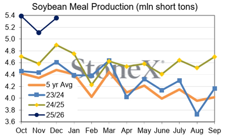 Động lực chính đằng sau tốc độ ép dầu kỷ lục này không chỉ đến từ dầu mà còn từ nhu cầu mạnh mẽ đối với khô đậu tương. Theo báo cáo, sản lượng khô đậu tương tháng 12 đạt 5,35 triệu tấn, tăng đáng kể so với mức 4,9 triệu tấn cùng kỳ năm ngoái. Nhu cầu lớn từ ngành chăn nuôi đối với khô đậu tương đã trở thành yếu tố then chốt thúc đẩy các nhà máy duy trì hoạt động ở công suất cao.