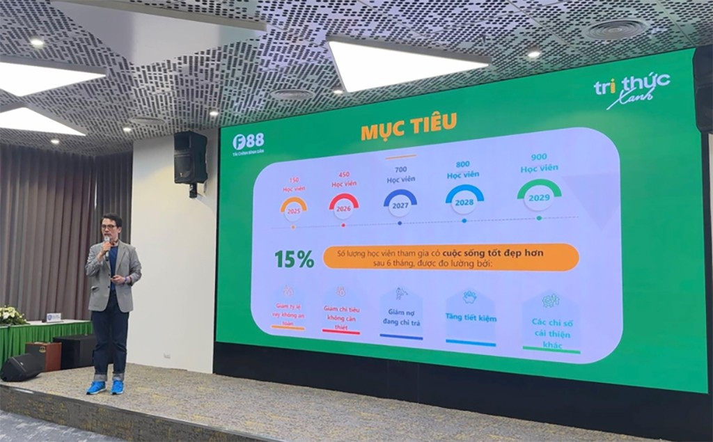Toàn bộ chương trình được cung cấp hoàn toàn miễn phí, giúp học viên hình thành các kỹ năng cơ bản như lập kế hoạch chi tiêu, tiết kiệm thông minh, tránh rủi ro vay nóng và tiếp cận đúng đắn với sản phẩm bảo hiểm. Cùng với đó, ứng dụng “Ví Xanh” do F88 phát triển đóng vai trò công cụ hỗ trợ, giúp học viên theo dõi thu chi, đặt mục tiêu tiết kiệm và duy trì thói quen tài chính lành mạnh mỗi ngày. Dự án kỳ vọng từ năm 2025 đến 2029 sẽ tiếp cận khoảng 3.000 học viên trên toàn quốc, trong đó ít nhất 15% học viên sẽ cải thiện đáng kể chất lượng cuộc sống chỉ sau sáu tháng tham gia.