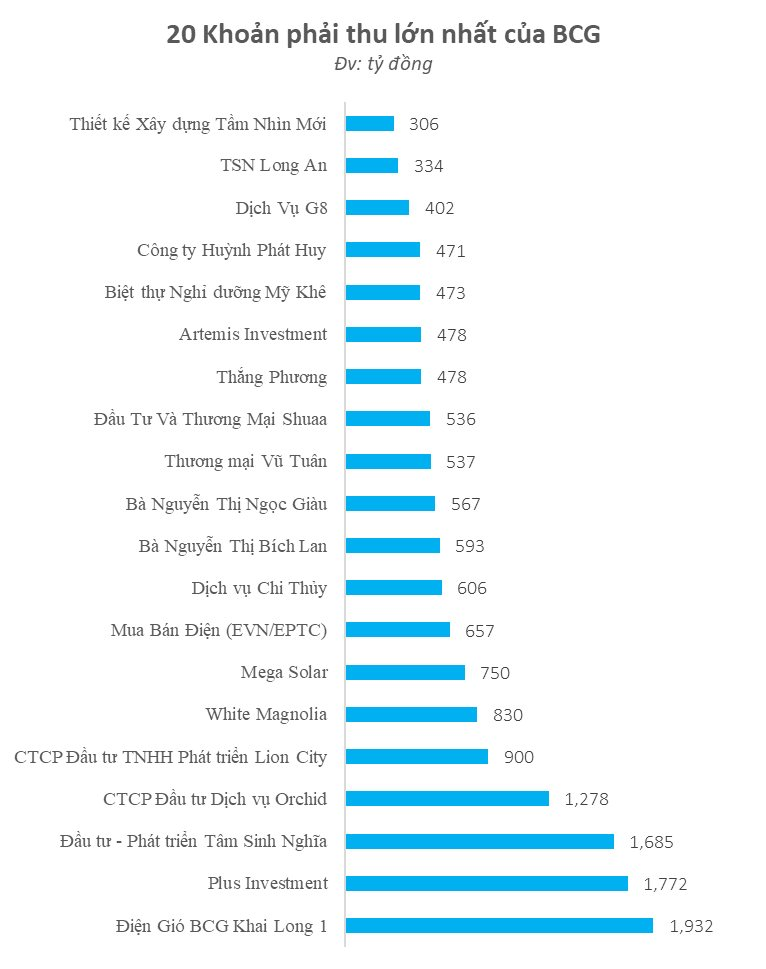 Các khoản phải thu này tập trung tại một nhóm các pháp nhân quen thuộc trong hệ sinh thái BCG. Ví dụ, phải thu đối với Công ty CP Điện Gió BCG Khai Long 1 là hơn 1.900 tỷ đồng, bao gồm gần 1.660 tỷ đồng phải thu hợp tác kinh doanh (BCC) ngắn hạn và 273 tỷ đồng cho vay ngắn hạn. Phải thu BCC với Công ty Cổ phần Đầu tư - Phát triển Tâm Sinh Nghĩa là hơn 1.684 tỷ đồng...