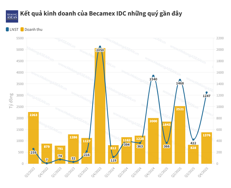 Về kết quả kinh doanh, trong quý 4/2025, doanh thu của Becamex đạt 1.376 tỷ đồng, giảm 31,2% so với cùng kỳ năm trước. Lợi nhuận gộp theo đó giảm 22,4%, còn 1.040 tỷ đồng. Trong kỳ, chi phí tài chính tăng 22,2% lên 434 tỷ đồng, chi phí quản lý doanh nghiệp tăng mạnh 99% lên 335 tỷ đồng, trong khi chi phí bán hàng giảm 11%, còn 279 tỷ đồng. Sau khi khấu trừ thuế phí, lợi nhuận sau thuế đạt 1.247 tỷ đồng, giảm 19% so với quý 4/2024.