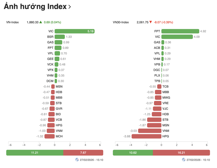 Kết phiên 27-2, VN-Index tăng 0,69 điểm (+0,04%) lên 1.880,33 điểm. Trong khi đó HNX-Index tăng 0,49 điểm (+0,19%) lên 262,82 điểm, UPCoM-Index tăng 0,46 điểm (+0,36%) lên 129,31 điểm. Trái ngược, VN30-Index giảm 8,07 điểm (-0,39%) còn 2.061,75 điểm.