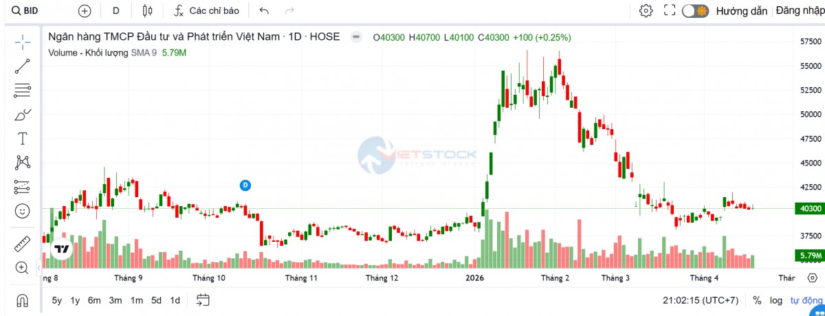 Trên thị trường chứng khoán, chốt phiên giao dịch cuối tuần qua (17/4), cổ phiếu BID đóng cửa tại 40.300 đồng, tăng nhẹ 100 đồng (+0,25%) so với phiên 16/4. Thanh khoản cải thiện rõ rệt khi khối lượng giao dịch đạt gần 5,8 triệu cổ phiếu, cao hơn đáng kể so với mức 4,3 triệu cổ phiếu của phiên liền trước.