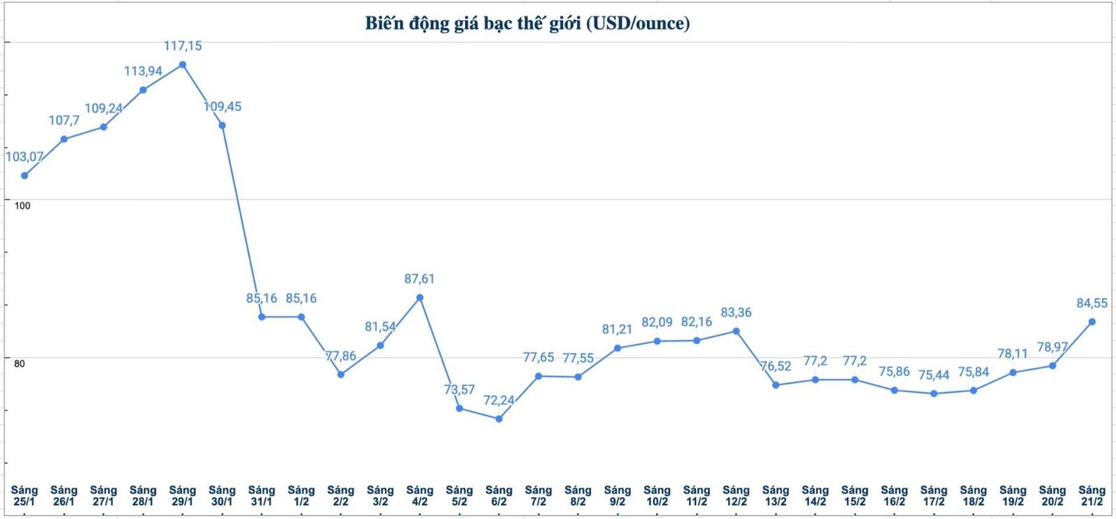 Trên thị trường thế giới, tính đến 12h00 ngày 21.2 (theo giờ Việt Nam), giá bạc thế giới niêm yết ở ngưỡng 84,55 USD/ounce; tăng 5,58 USD so với sáng qua.