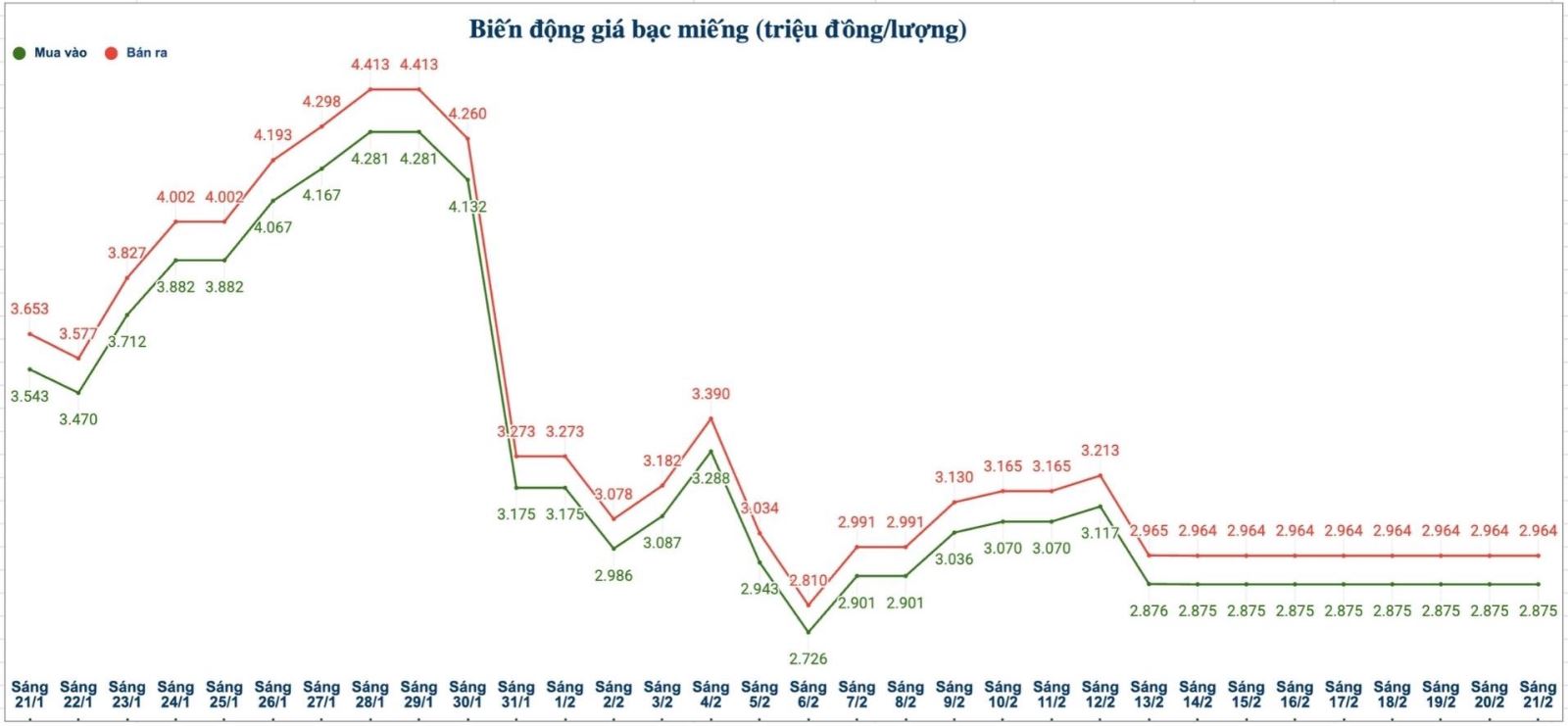 Cùng thời điểm, giá bạc miếng 999 (1 lượng) tại Tập đoàn Vàng bạc Đá quý Phú Quý niêm yết ở ngưỡng 2,875 - 2,964 triệu đồng/lượng (mua vào - bán ra).