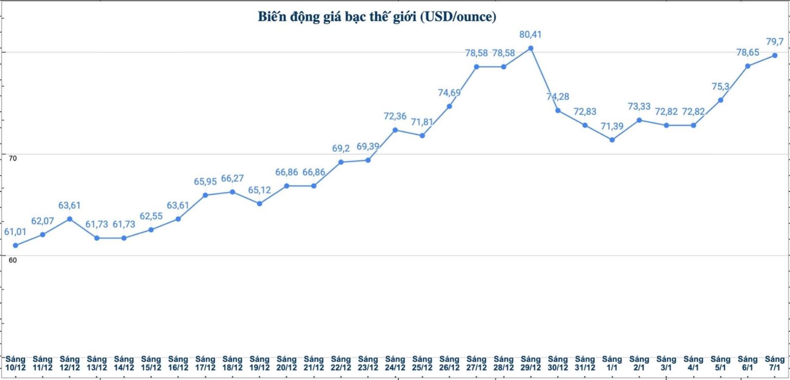 Trên thị trường thế giới, tính đến 11h35 ngày 7.1 (theo giờ Việt Nam), giá bạc thế giới niêm yết ở ngưỡng 79,7 USD/ounce; tăng 1,05 USD so với sáng qua.