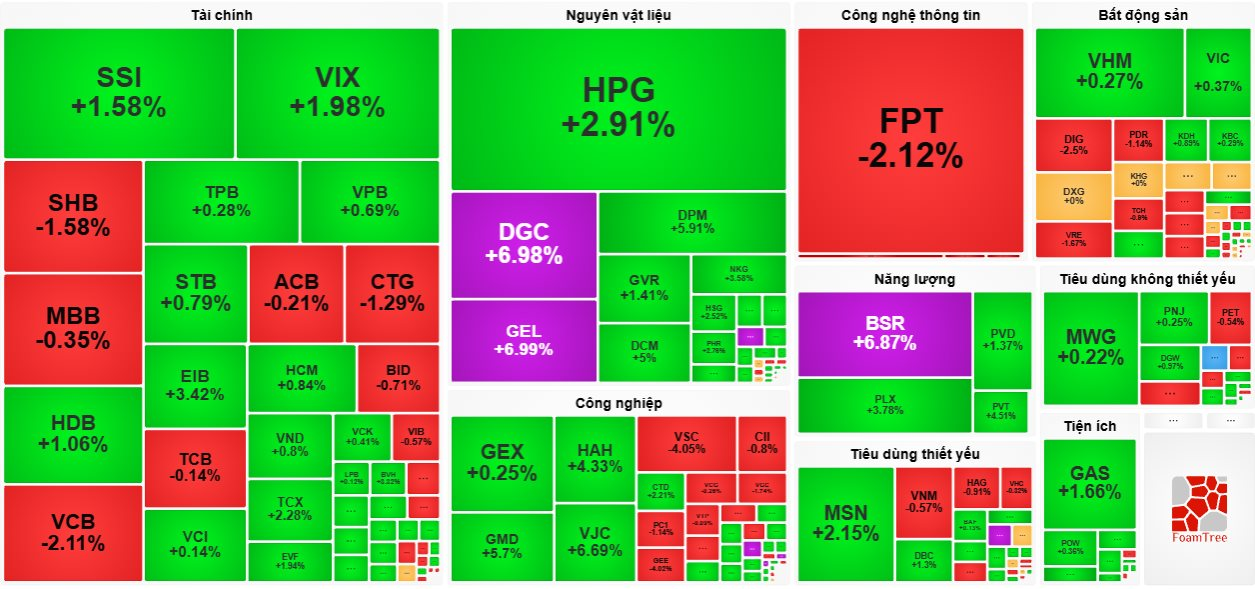 Cổ phiếu phân bón ghi nhận phiên giao dịch sôi động, trở thành tâm điểm “gom hàng” từ các nhà đầu tư, với: DGC +6,98%, BFC +6,99%, DPM +5,91%, DCM +5%, CSV +3,52%, ..