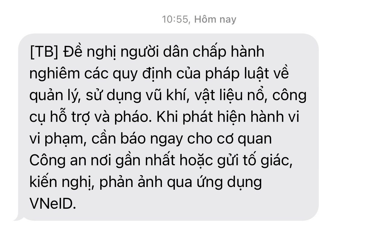 Mới đây, Bộ Công an đã gửi tin nhắn thông báo đến từng thuê bao với nội dung sau: Đề nghị người dân chấp hành nghiêm các quy định của pháp luật về quản lý, sử dụng vũ khí, vật liệu nổ, công cụ hỗ trợ và pháo. Khi phát hiện hành vi vi phạm, cần báo ngay cho cơ quan Công an nơi gần nhất hoặc gửi tố giác, kiến nghị, phản ánh qua ứng dụng VNeID.