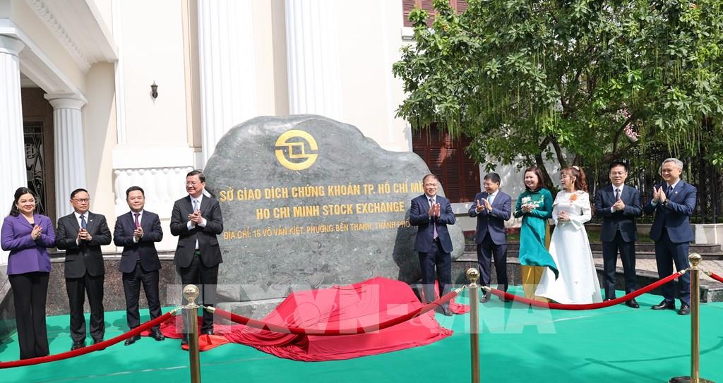 Dịp này, HoSE cũng ra mắt bảng tên mới, với chất liệu bằng đá hoa cương xanh, biểu trưng cho các giá trị công bằng, công khai, minh bạch và khẳng định bước phát triển mới của thị trường chứng khoán. Ảnh: Hứa Chung-TTXVN