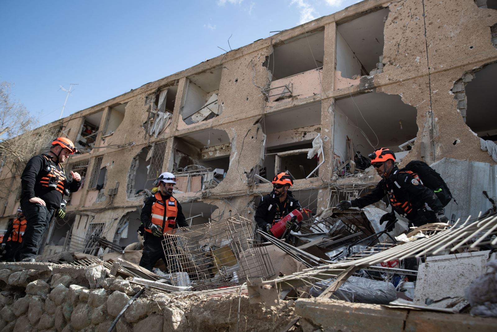 Lực lượng cứu hộ làm nhiệm vụ tại hiện trường một vụ tấn công bằng tên lửa của Iran nhằm vào thành phố Dimona, Israel, ngày 22/3/2026. Ảnh: THX/TTXVN