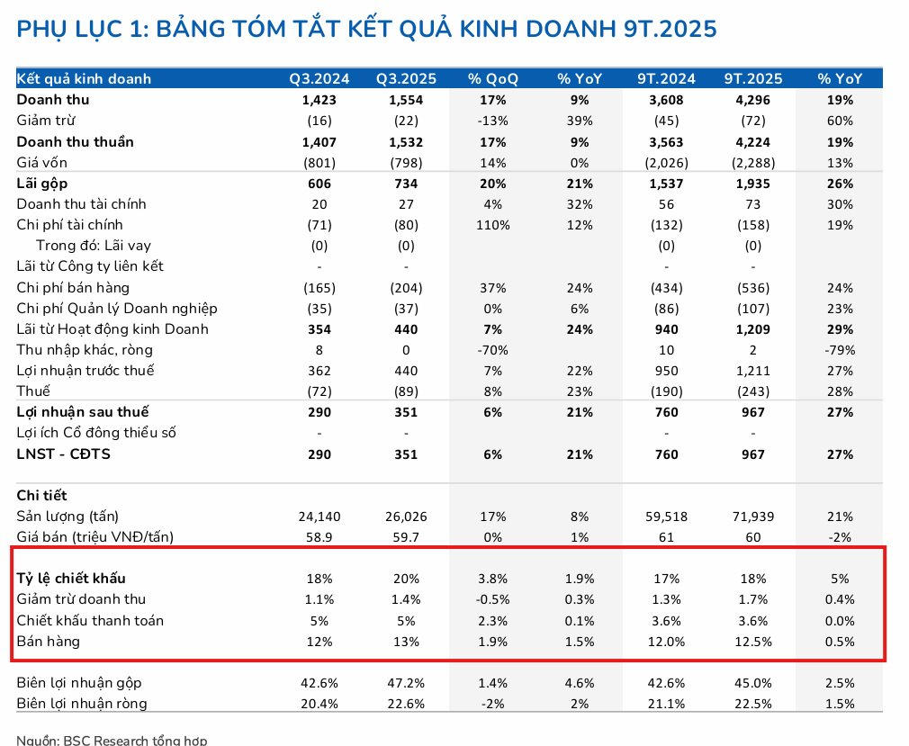 Báo cáo tài chính quý 3/2025 của Nhựa Bình Minh cho thấy sự thay đổi rõ rệt trong cơ cấu chi phí kinh doanh. Mặc dù doanh thu thuần đạt 1.554 tỷ đồng, tăng 9% so với cùng kỳ, nhưng các khoản giảm trừ doanh thu, chiết khấu thanh toán và chi phí bán hàng cũng ghi nhận xu hướng tăng mạnh.