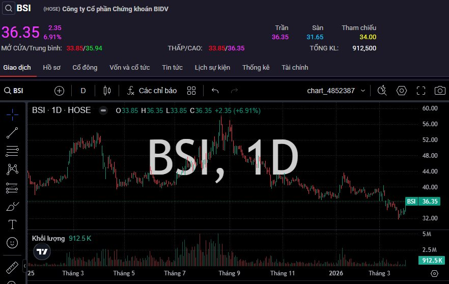Đóng cửa phiên 31/3, cổ phiếu BSI của Chứng khoán BIDV (BSC) tăng kịch trần lên mức 36.350 đồng/cp với hơn 200.000 đơn vị dư mua giá trần.