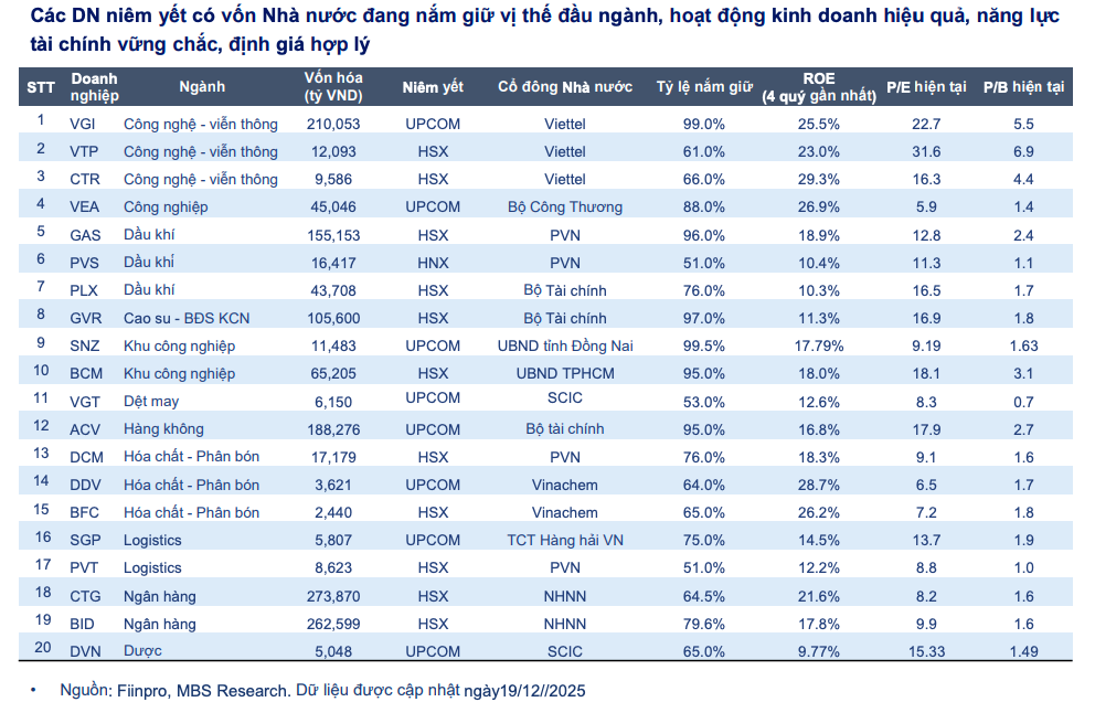 Tương tự như tác động tích cực mà Nghị quyết số 68-NQ/TW của Bộ Chính trị về phát triển kinh tế tư nhân mang lại, năm 2026, MBS kỳ vọng, nhóm doanh nghiệp niêm yết có vốn nhà nước, đặc biệt là các doanh nghiệp đầu ngành, sở hữu nền tảng tài chính vững vàng, hiệu quả hoạt động tốt và mức định giá hấp dẫn sẽ trở thành điểm sáng trên thị trường. Đồng thời, nghị quyết mới cũng được kỳ vọng tạo hành lang pháp lý vững chắc cho việc sắp xếp lại danh mục đầu tư, thúc đẩy tiến trình thoái vốn, niêm yết và cổ phần hóa vốn nhà nước vốn đã chậm lại trong thời gian qua.