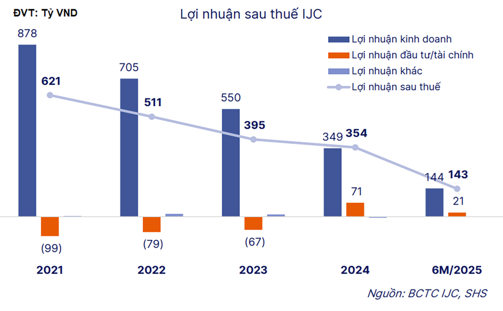 Doanh thu IJC giai đoạn 2021 - 2024 có sự sụt giảm mạnh từ 2.602 tỷ đồng về 1.020 tỷ đồng chủ yếu do tình hình bán hàng kém khả quan trong lĩnh vực bất động sản dân cư. Trong khi đó, hoạt động thu phí duy trì doanh thu khá ổn định. Do đó, thị trường cũng đã chứng kiến sự sụt giảm lợi nhuận kinh doanh của IJC trong giai đoạn này.