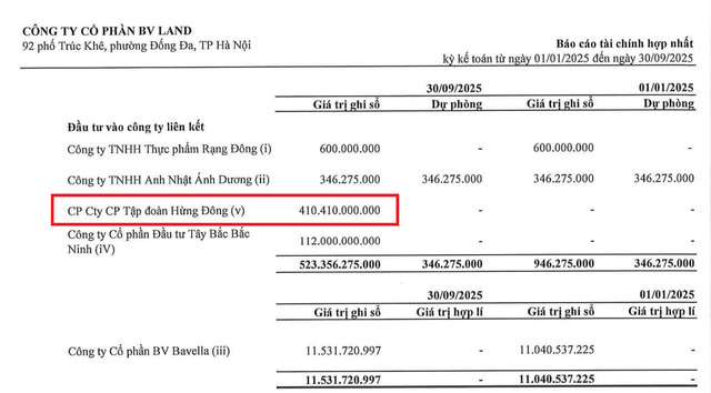 Theo Báo quý III/2025 vừa công bố của CTCP BV Land (mã chứngkhoán: BVL) cho thấy, trong quý doanh nghiệp này đã chi hơn 410,4 tỷ đồng đểmua cổ phần tại CTCP Tập đoàn Hừng Đông (Hừng Đông Group).