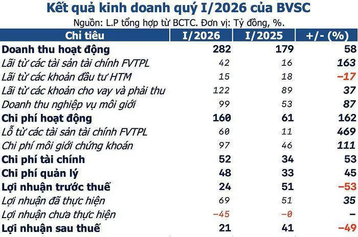 Doanh thu tăng trong quý I nhưng lợi nhuận của BVSC giảm 49% so với cùng kỳ khi chi phí và biến động danh mục đầu tư gia tăng.