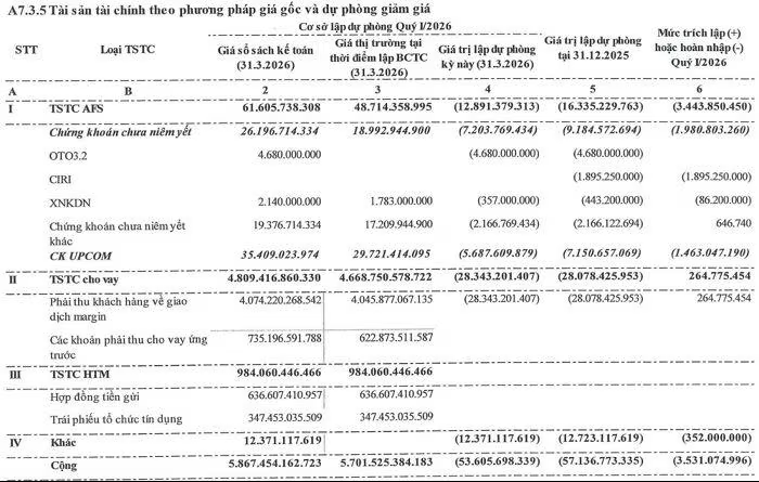 Danh mục tài sản tài chính sẵn sàng để bán (AFS) tăng 1% theo giá gốc, trong khi giá trị thuần (giá trị hợp lý trừ đi trích lập dự phòng) gần như không thay đổi. Một số khoản đầu tư trong danh mục này bao gồm các chứng khoán chưa niêm yết như OTO3.2, CIRI, XNKDN và một số mã trên UPCoM.