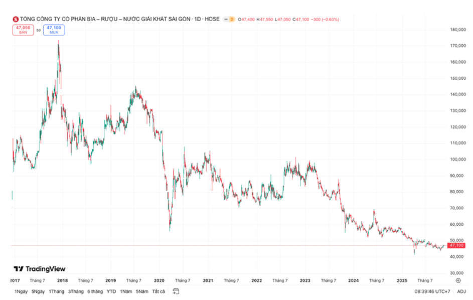 Song tính đến tháng 11-2025, SAB giao dịch quanh 47.000 đồng/cổ phiếu, vốn hóa về còn khoảng 60.000 tỉ đồng, thấp hơn 60-65% so với vùng đỉnh gần 130.000 đồng/cổ phiếu (sau điều chỉnh) ở thời điểm cuối năm 2017. Điều này cho thấy ThaiBev hiện vẫn còn cách khá xa điểm hòa vốn, nếu xét theo thị giá.