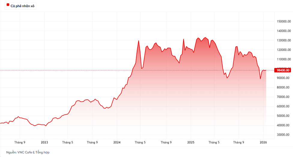 Nhìn vào biểu đồ tổng hợp từ năm 2021 đến 2026, thị trường Cà phê nhân xô Việt Nam đã chính thức đi qua giai đoạn "Siêu chu kỳ tăng giá". Sau khi đạt đỉnh lịch sử quanh 134,000 VND, giá đã chuyển sang giai đoạn "Biến động lớn và Phân phối".