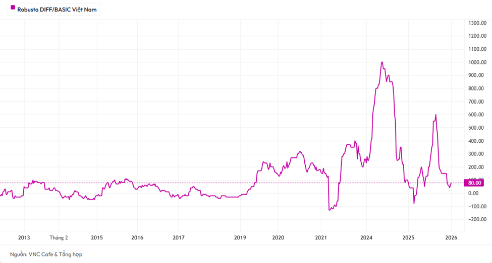 Biểu đồ Hết thời "Giá ảo" Biểu đồ Chênh lệch giá (Differential) cho thấy mức Premium của hàng Việt Nam hiện chỉ còn quanh mốc +80 USD/tấn. So với các mức đỉnh cao 600 - 1.000 USD trước đây, con số này là một sự "bốc hơi" giá trị khổng lồ.