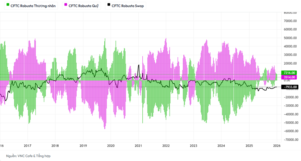 Biểu đồ CFTC cho thấy một sự phân kỳ lịch sử. Vị thế Mua ròng của Quỹ đã co cụm về mức tối thiểu 3.514 lô, xóa sạch mọi thành quả tăng nóng của năm ngoái. Ngược lại, nhóm Thương nhân đã đảo chiều ngoạn mục sang Mua ròng 7.216 lô. Khi Commercials (những người làm hàng thực) chuyển sang Net Long, điều đó có nghĩa là Vùng giá này là vùng giá trị thực. Các đối thủ lớn trên thế giới đang âm thầm tích lũy hàng vật chất thông qua các hợp đồng phái sinh. Nếu chúng ta tiếp tục chờ đợi giá sập sâu hơn, chúng ta có thể sẽ lỡ nhịp với dòng chảy của "Smart Money" cùng ngành.
