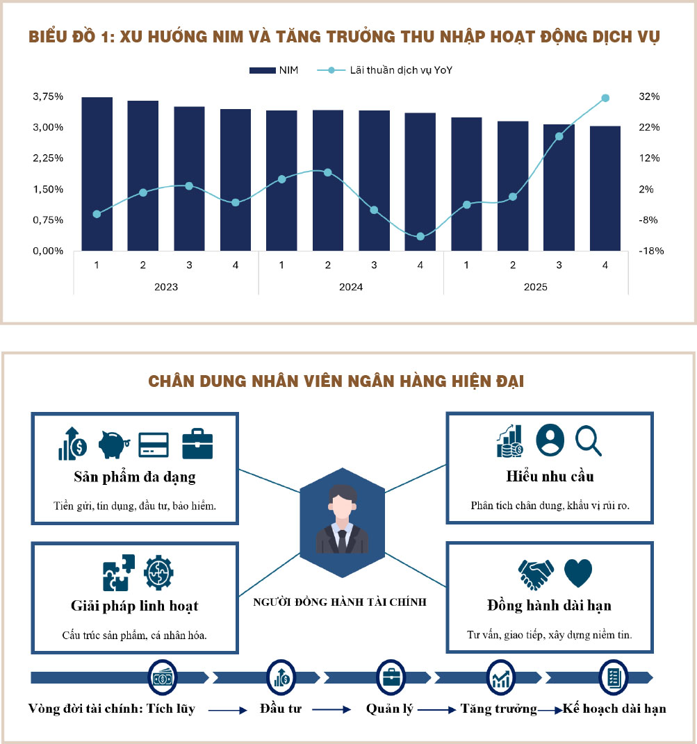 Nói cách khác, khi động lực lợi nhuận từ tín dụng không còn như trước, ngân hàng sẽ phải mở rộng năng lực khai thác thu nhập từ dịch vụ thông qua khả năng tư vấn sâu hơn nhu cầu khách hàng, từ tư vấn, đầu tư, quản lý tài sản cho tới bảo hiểm và giao dịch quốc tế. Hệ sinh thái tài chính toàn diện vì thế không phải là một tham vọng xa xỉ, mà là câu trả lời rất thực tế cho bài toán tăng trưởng trong bối cảnh NIM suy giảm.