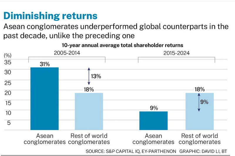 Các tập đoàn ASEAN hoạt động kém hiệu quả hơn so với các đối thủ toàn cầu trong thập kỷ vừa qua, trái ngược với giai đoạn trước đó.