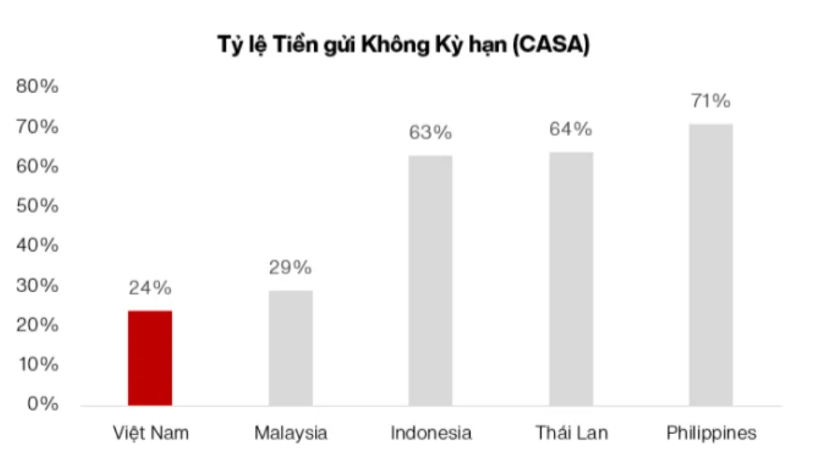 Môi trường lãi suất tăng nhẹ - với lãi suất tiền gửi kỳ hạn 12 tháng có thể tăng thêm 50-100 điểm cơ bản - nhìn chung mang lại lợi ích cho các ngân hàng có chi phí vốn thấp. Tuy nhiên, tỷ lệ CASA (tiền gửi không kỳ hạn) của hệ thống ngân hàng Việt Nam vẫn tương đối thấp (khoảng 20-25%), khiến dư địa mở rộng biên lãi ròng (NIM) không quá lớn. Do đó, việc tránh các ngân hàng có tỷ lệ cho vay trên huy động (LDR) quá cao, đồng thời tập trung vào những ngân hàng có chất lượng tài sản tốt và năng lực quản trị rủi ro hiệu quả, sẽ là yếu tố quyết định thành công.