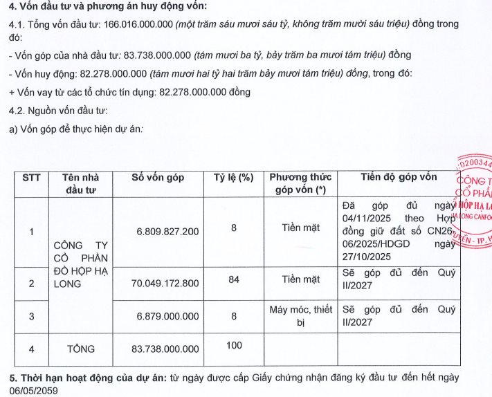 Trên quỹ đất mới này, Đồ hộp Hạ Long sẽ triển khai Dự án Nhà máy sản xuất đồ hộp Hạ Long Hải Phòng với tổng mức đầu tư hơn 166 tỷ đồng. Cơ cấu vốn bao gồm khoảng 83,7 tỷ đồng vốn tự có và hơn 82,2 tỷ đồng vốn vay tín dụng.