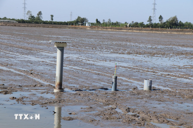 Nông dân tham gia mô hình sử dụng các thiết bị cảm biến đo mực nước và phần mềm giám sát việc bón phân theo nguyên tắc khuyến cáo "4 đúng" (đúng loại, đúng liều lượng, đúng thời điểm và đúng cách). (Ảnh: Thu Hiền/TTXVN)