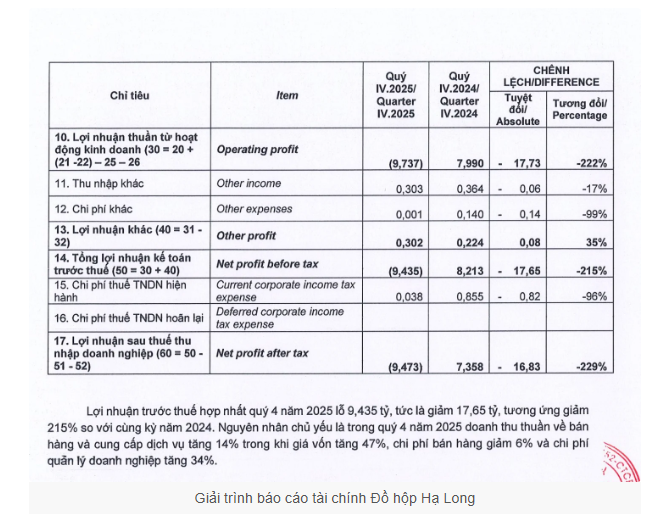 Theo báo cáo tài chính quý IV/2025, Công ty cổ phần Đồ hộp Hạ Long ghi nhận doanh thu thuần đạt hơn 192 tỷ đồng, tăng 24% so với cùng kỳ, song lợi nhuận sau thuế lại âm gần 9,5 tỷ đồng.