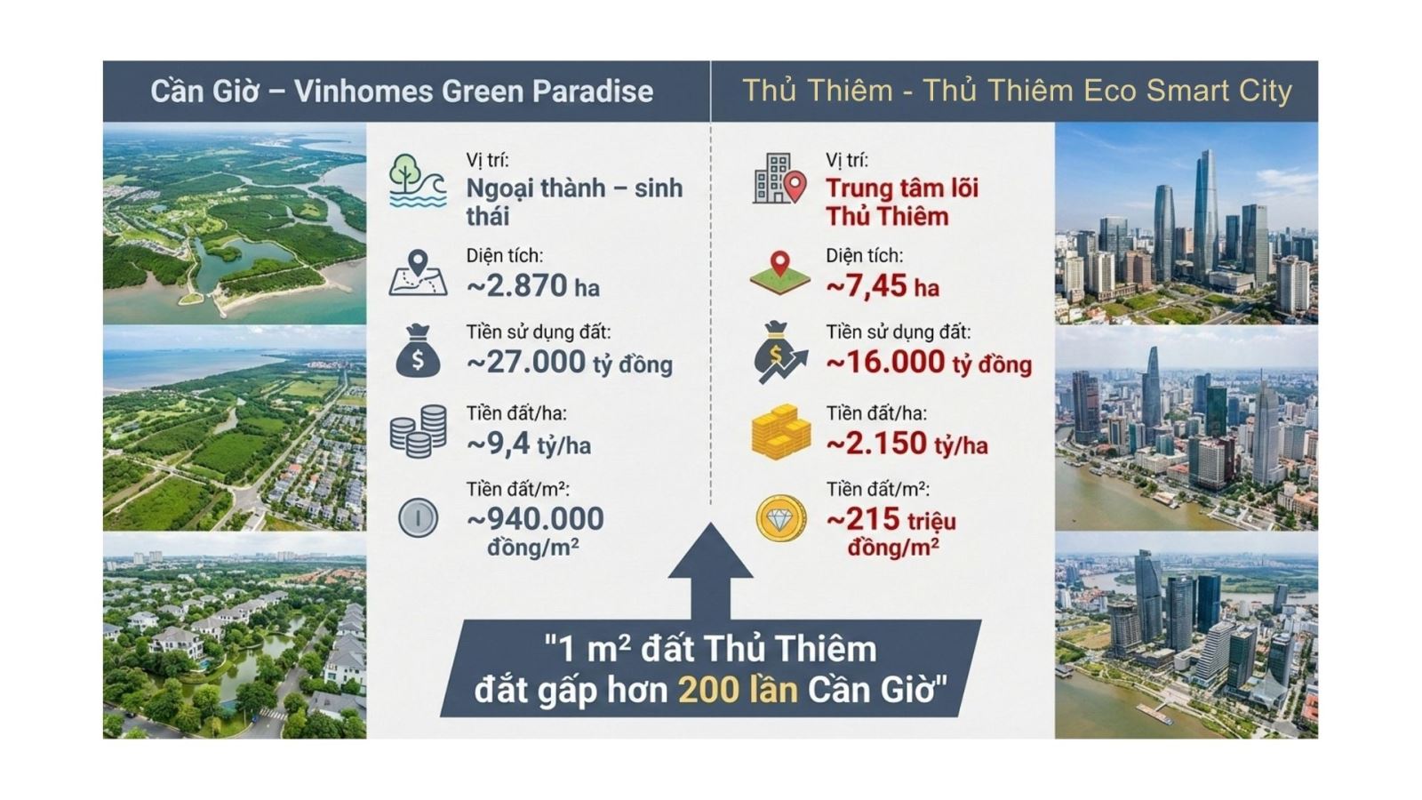 Trong khi Vinhomes Cần Giờ có diện tích lên đến 2.900 ha đã được đóng tiền đất và triển khai rầm rộ thì Thủ Thiêm Eco Smart City rộng chưa đến 8 ha, giá đất trên mỗi m2 hơn 200 triệu đồng và vẫn án binh bất động.