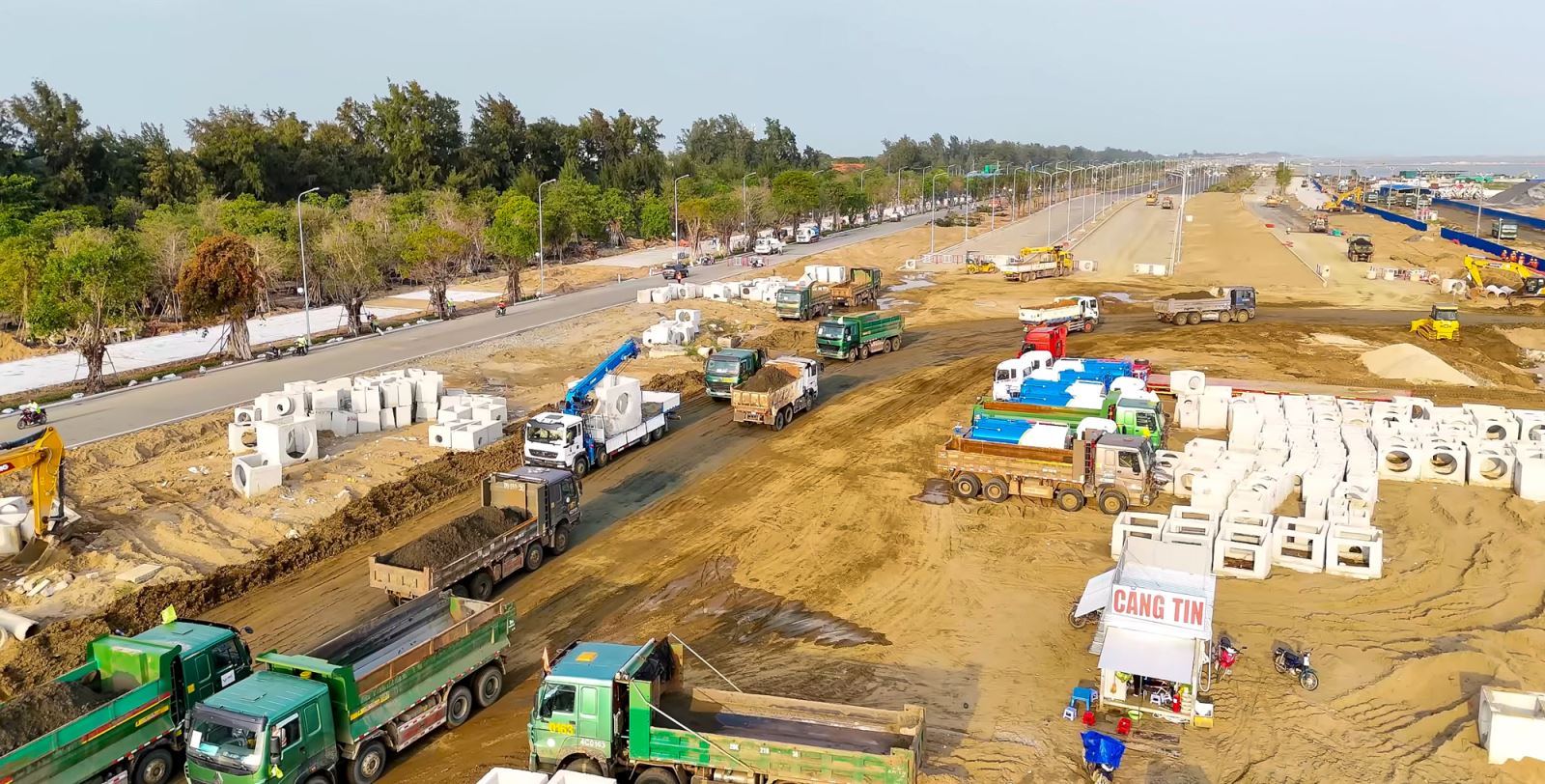Công trường thi công nhộn nhịp, tuyến đường trục chính đã được thảm nhựa, cùng với việc bố trí cảnh quan hai bên từng bước hoàn thiện. Ảnh: Cường SG.