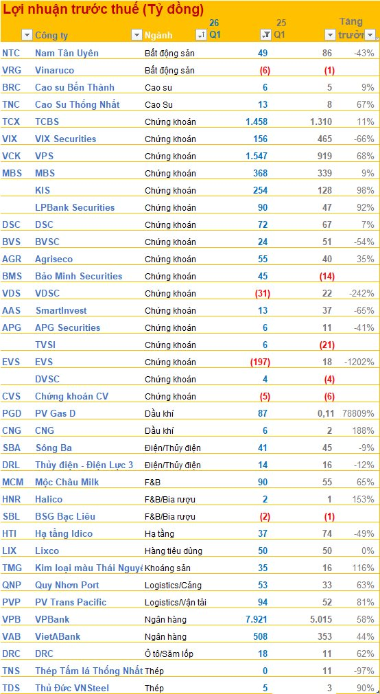 Nhóm ngân hàng, VPBank (VPB ) với lợi nhuận trước thuế Quý 1/2026 đạt 7.921 tỷ đồng, tăng trưởng 58% so với cùng kỳ năm 2025.