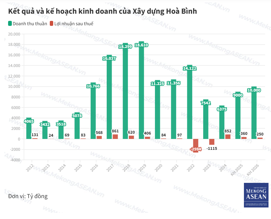 Tập đoàn Xây dựng Hoà Bình (mã HBC) lên kế hoạch năm 2026 với doanh thu 10.000 tỷ đồng, lợi nhuận sau thuế hợp nhất 250 tỷ đồng.