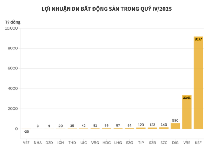 Bức tranh lợi nhuận quý IV/2025 và cả năm 2025 của nhóm doanh nghiệp bất động sản cho thấy sự phân hóa rõ nét, khi nhiều doanh nghiệp bứt tốc mạnh mẽ, song không ít đơn vị ghi nhận mức sụt giảm sâu so với cùng kỳ. Đáng chú ý, nhóm bất động sản thương mại, nhà ở và khu công nghiệp tiếp tục đóng vai trò động lực chính cho tăng trưởng toàn ngành.