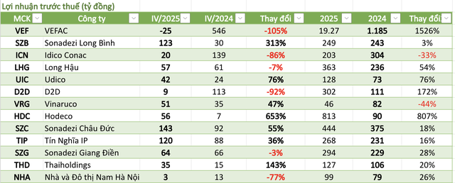Một số doanh nghiệp trong nhóm bất động sản vừa công bố kết quả kinh doanh quý IV/2025 và cả năm 2025 như Tín Nghĩa IP, Sonadezi Giang Điền, Thaiholdings và Nhà và Đô thị Nam Hà Nội ghi nhận nhiều diễn biến trái chiều, phản ánh rõ sự phân hóa trong ngành.