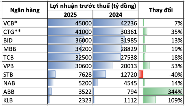 Theo thông tin tại Hội nghị tổng kết công tác Đảng và hoạt động kinh doanh năm 2025, lãnh đạo Vietcombank cho biết lợi nhuận trước thuế năm 2025 của ngân hàng tăng hơn 7% so với năm 2024 và theo phê duyệt của Ngân hàng Nhà nước. Với lợi nhuận hợp nhất trước thuế năm 2024 đạt hơn 42.200 tỷ đồng, ước tính mức lãi năm 2025 của Vietcombank đạt trên 45.000 tỷ đồng – mức cao nhất lịch sử.