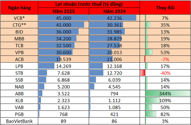 Theo thông tin tại Hội nghị tổng kết công tác Đảng và hoạt động kinh doanh năm 2025, lãnh đạo Vietcombank cho biết lợi nhuận trước thuế năm 2025 của ngân hàng tăng hơn 7% so với năm 2024 và theo phê duyệt của Ngân hàng Nhà nước. Với lợi nhuận hợp nhất trước thuế năm 2024 đạt hơn 42.200 tỷ đồng, ước tính mức lãi năm 2025 của Vietcombank đạt trên 45.000 tỷ đồng – mức cao nhất lịch sử.