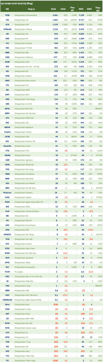 Ở nhóm công ty quy mô trung bình và nhỏ, nhiều doanh nghiệp ghi nhận mức tăng trưởng rất cao nhờ nền lợi nhuận thấp của năm trước. LPBS tăng 553%, OCBS tăng 753%, ASAM tăng hơn 1.200%. Tuy nhiên, bức tranh toàn ngành không hoàn toàn màu hồng khi vẫn có không ít công ty lợi nhuận sụt giảm mạnh hoặc tiếp tục thua lỗ trong cả năm 2025, như ORS, TVB, TCI hay APS.