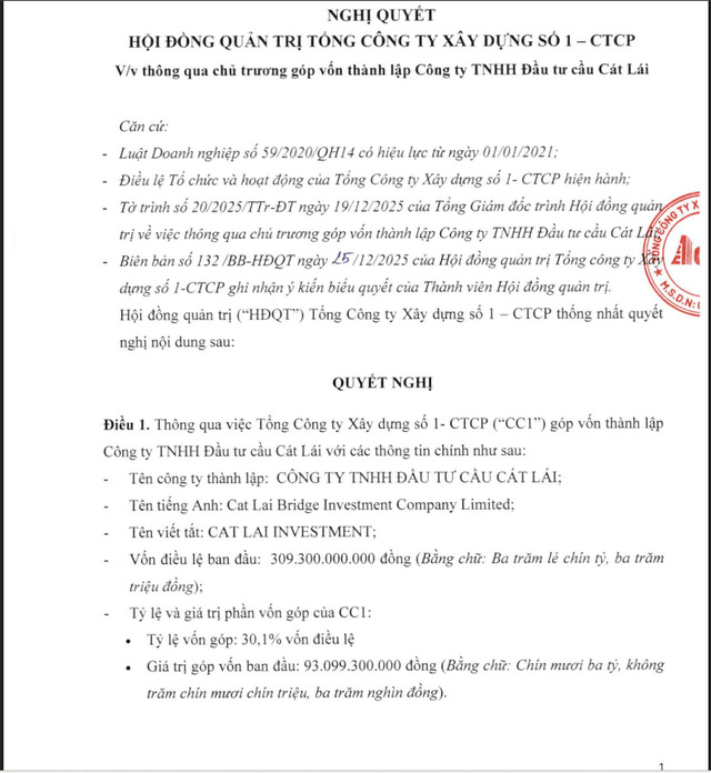 Đồng thời, CC1 cũng góp vốn thành lập Công ty TNHH Đầu tư cầu Cát Lái, vốn điều lệ 309.3 tỷ đồng. Trong đó CC1 góp 30.1% vốn, tương đương hơn 93 tỷ đồng.