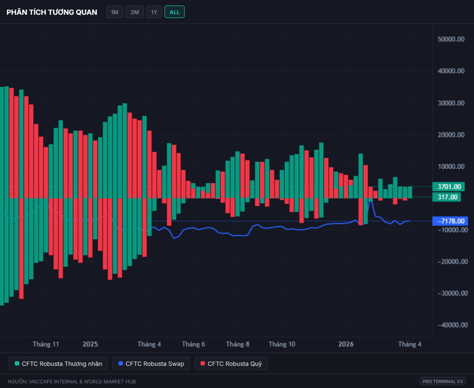 Quy mô vị thế ròng hiện tại của Managed Money đang ở mức cực kỳ thấp, chỉ đạt 317 lot mua ròng, con số này gần như không đáng kể khi so với mức trung bình 3 năm là 28.690 lot. Điều này đồng nghĩa với việc vị thế ròng hiện tại chỉ bằng khoảng 1,1% so với mức trung bình dài hạn và cách rất xa mức đỉnh lịch sử là 49.673 lot. Sự sụt giảm quy mô vị thế ròng so với cùng kỳ năm ngoái (14.459 lot) phản ánh một thực tế là dòng tiền đầu cơ lớn đã rút khỏi thị trường Robusta sau giai đoạn biến động mạnh. Tuy nhiên, nhìn từ góc độ dư địa, việc vị thế ròng đang ở vùng đáy lịch sử cho thấy thị trường đang ở trạng thái "rỗng" vị thế mua. Đây là điều kiện cần để kích hoạt một đợt hồi phục mạnh nếu các yếu tố cung-cầu cơ bản chuyển hướng tích cực.