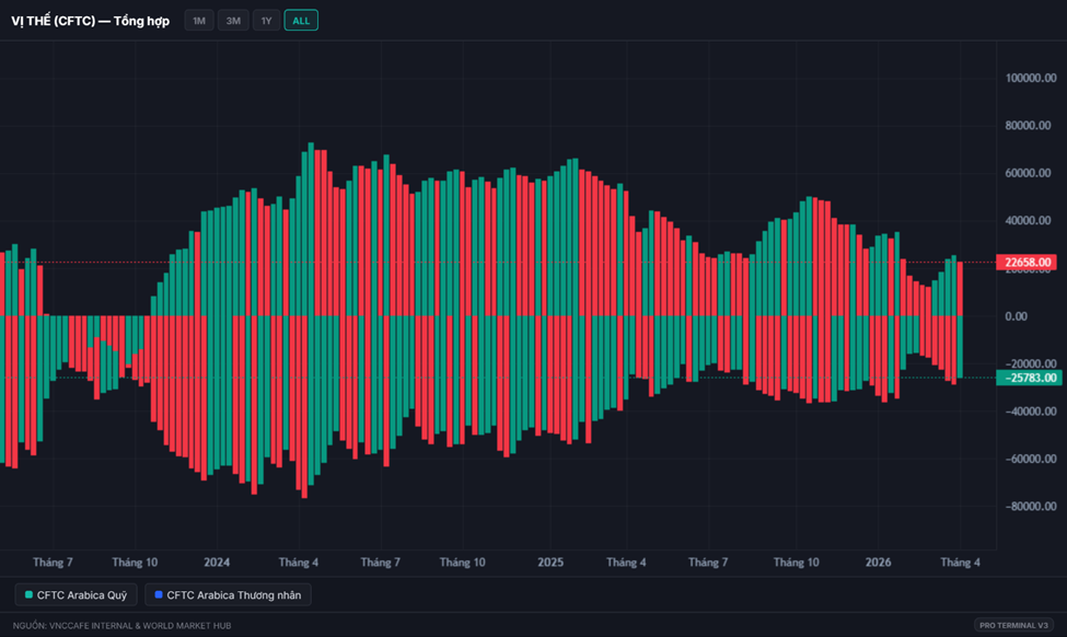 Nhóm Producer/Merchant đang cho thấy xu hướng thu hẹp các hoạt động phòng hộ bán khống khi giá Arabica đi vào vùng điều chỉnh. Vị thế ròng của nhóm này đạt âm 25.783 lot, cải thiện 2.939 lot so với tuần trước đó. Hành động này chủ yếu đến từ việc đóng 2.602 lot vị thế bán (về mức 72.524 lot) trong khi vị thế mua chỉ tăng nhẹ 337 lot. Khi giá KCK2026 lùi sâu từ vùng đỉnh cũ, bên bán thực tế không còn mặn mà với việc khóa giá ở các mức thấp hơn. Việc họ chủ động mua lại các hợp đồng bán khống cho thấy kỳ vọng rằng giá sẽ có nhịp hồi phục hoặc ít nhất là không giảm sâu hơn trong ngắn hạn. So với mức trung bình 3 năm của nhóm này là âm 49.556 lot, áp lực bán phòng hộ hiện tại đang ở mức rất thấp, điều này làm giảm bớt sức nặng phía trên của thị trường.